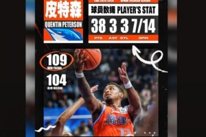 本场比赛,福建外援皮特森表现出色,进攻端势不可挡,外线神准的同时杀伤力也很强,最后时刻连续五罚全部命中,首发出战30分钟,投篮23中10,三分球14中7,罚球13中11,砍下38分3篮板3助攻3抢断的数据,正负值+12。