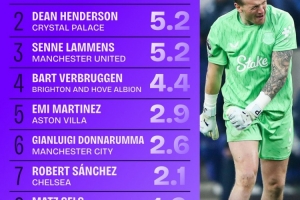 本赛季英超门将阻止进球榜:皮克福德6球居首,拉门斯5.2球