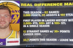 湖人VS奇才,转播方晒出东契奇赛季数据:
