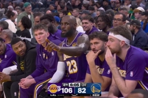 GIF——詹姆斯致场边球迷:“放轻松,好好看球。”(“You need to relax. Watch the game.”)
