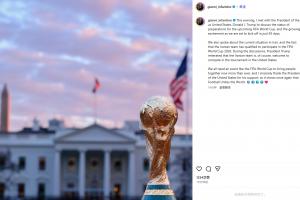 因凡蒂诺写道:“今晚,我会见了美国总统特朗普,讨论了即将举行的FIFA世界杯的筹备情况,并表达了我们对93天后世界杯即将开赛的激动心情。